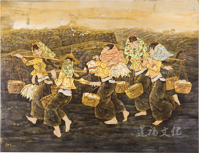 作品《護(hù)渠人家》:2017中國(廈門)漆畫展評委作品。(中國美術(shù)家協(xié)會主辦)2017年。