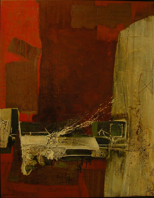 與前面所談到的具有深厚文化內涵的作品相比,《構成》(2006)是一幅更加純粹的抽象繪畫。畫面中剔除了他常用的拼貼和壓印雕版的手法,以黑白紅為主調的幾何形,懸浮在灰色的背景上,色調和諧幽雅?!稌煛罚?009)亦屬于純粹的抽象繪畫,整個畫面籠罩在紅色調里,暗示著被陽光映紅的天空。平整的背景與畫面左下方大面積刮劃出來的表面以及右側布紋的肌理形成了非常強烈的對比,使畫面的視覺效果更為豐富。近年來,程向君一直在不斷嘗試這類沒有任何暗示和隱喻符號的作品,讓繪畫承載更為直接的心靈溝通的作用。