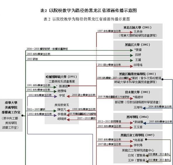 ②表2說(shuō)明:①院校名稱(chēng)後方括號(hào)內(nèi)的數(shù)字,表示該院校開(kāi)始漆畫(huà)教學(xué)的年份;②人名前方的*符號(hào)表示該教師為所在院校的漆畫(huà)學(xué)科帶頭人;③漆畫(huà)傳播具體路線用彩色直線與箭頭表示。