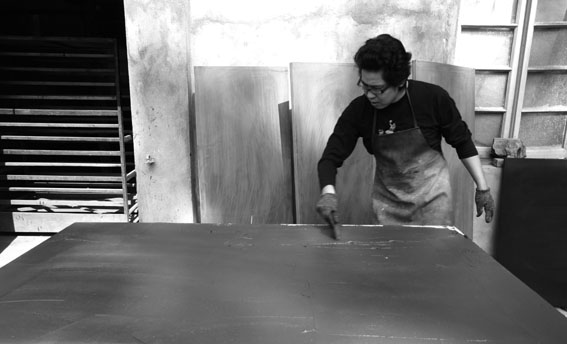 此步奏是漆畫的最后層次,決定畫面的基本色調(diào),他有髹涂法、罩明法、多層法。在中層與上層的不同階段可根據(jù)需要進行局部或全部的初磨。