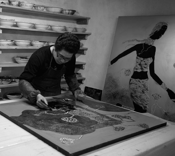 ②罩明 即用透明的漆罩于不同的漆地上,因底漆色相不同,又有“罩黃”、“罩朱”等。此法光明瑩徹,若在銀下變涂肌理,經(jīng)細心打磨,可顯現(xiàn)豐富多彩的效果,這也是漆畫主要的技法語言。