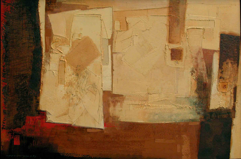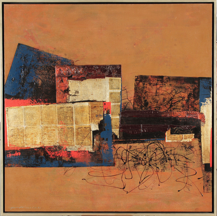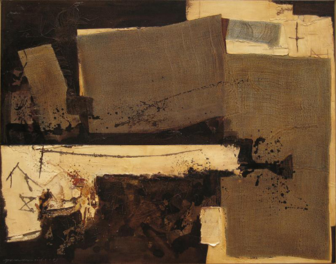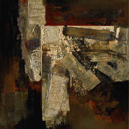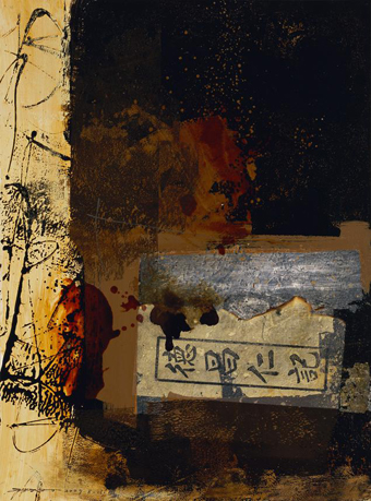像很多藝術家一樣,程向君對西藏充滿向往,曾多次赴藏區(qū)寫生。在他以西藏為主題創(chuàng)作的系列作品中,《格拉丹東序曲》(2006)最具代表性。他用自己從古物市場中淘選到的藏文雕版在未干的漆上壓印出凸凹的文字,它們更多地是一種文化與精神的象征而非等待釋讀的內容,同時也成為畫面構圖的重要組成部分。與絕大多數以寫實手法表現的西藏主題相比,程向君的繪畫更接近藏文化所臻的精神境界,而非對一個陌生環(huán)境和少數民族的獵奇。程向君在繪畫中引入雕版印痕的做法,非常類似畢加索在綜合的立體主義時期創(chuàng)造的“拼貼”(collage),其目的是聯系畫面與現實。屬于這個系列的作品還有《夏河的回憶》(2004)與《丹巴之旅》(2004)等。