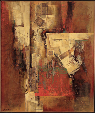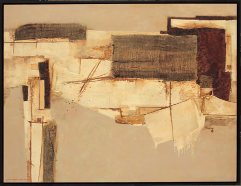 與前面所談到的具有深厚文化內涵的作品相比,《構成》(2006)是一幅更加純粹的抽象繪畫。畫面中剔除了他常用的拼貼和壓印雕版的手法,以黑白紅為主調的幾何形,懸浮在灰色的背景上,色調和諧幽雅?!稌煛罚?009)亦屬于純粹的抽象繪畫,整個畫面籠罩在紅色調里,暗示著被陽光映紅的天空。平整的背景與畫面左下方大面積刮劃出來的表面以及右側布紋的肌理形成了非常強烈的對比,使畫面的視覺效果更為豐富。近年來,程向君一直在不斷嘗試這類沒有任何暗示和隱喻符號的作品,讓繪畫承載更為直接的心靈溝通的作用。