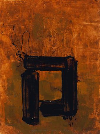 麻和紙本漆畫是程向君近年來對漆畫材料的大膽嘗試,雖然在表現語言上與木板漆畫的區(qū)別不是很大,但是產生了很多意想不到的獨特效果。繪制于紙本上的漆畫,由于載體薄弱,因此對肌理的處理相對簡單,漆也上得較薄,大漆的棕褐色調成為畫面的主調,但是畫面的效果也更加純粹。在談到這類作品時,程向君說自己一開始并不知道畫面完成后的樣子,而是根據用大漆制作底子時產生的偶然效果進行下一步的創(chuàng)作。這段告白,很容易讓人聯想到當年杰克遜•波洛克帶有自動主義痕跡的創(chuàng)作手法。以麻為底的漆畫,程向君更強調麻布本身的肌理與漆的對比,他故意保留了麻布本身不規(guī)則的邊緣,為畫面增加了一種浮雕般的感覺。