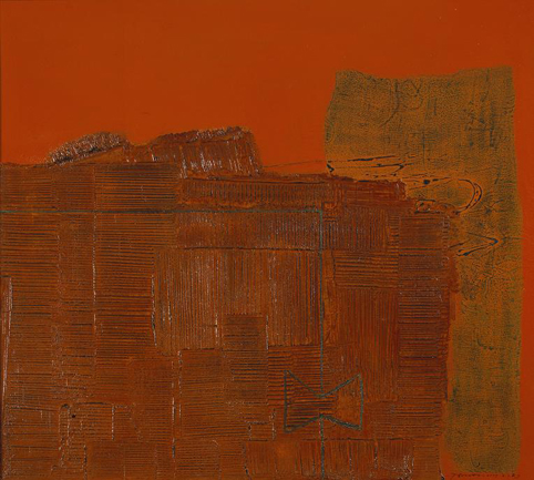 《紅墻下的記憶》(2009)所表現的是一種在北京長期生活過的人才有的經歷。畫面上方占主導地位的斑駁的紅色讓人想起皇城墻壁上歲月的痕跡,畫面下方半透明的棕褐色調中透出的古籍文字,這不僅是漆畫獨有的效果,同時也隱喻著紅墻背后所遮蔽的歷史與文明。乍看之下,這件作品很容易讓人聯想到美國抽象表現主義畫家克利福德•斯蒂爾的色域繪畫,但是程向君顯然有著更多的對畫面背后精神世界的思考。