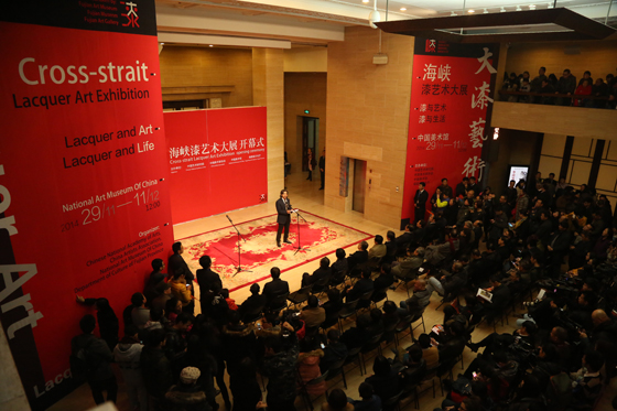 中國美術(shù)館11月30日訊 11月29日下午,由中國藝術(shù)研究院、中國美術(shù)家協(xié)會、中國美術(shù)館、福建省文化廳聯(lián)合主辦,福建省美術(shù)館、福建博物院、福建省藝術(shù)館承辦的“大漆藝術(shù)——2014海峽漆藝術(shù)大展”開幕式在中國美術(shù)館舉行。文化部副部長項兆倫、董偉,福建省人大常委會副主任劉群英,中宣部文藝局局長湯恒,中央美術(shù)學院院長范迪安等領(lǐng)導出席開幕式。中國藝術(shù)研究院副院長呂品田,中國美協(xié)秘書長徐里,中國美術(shù)館館長吳為山,福建省文化廳廳長陳秋平在開幕式上先后致辭。福建省文化廳副廳長陳吉主持開幕式。