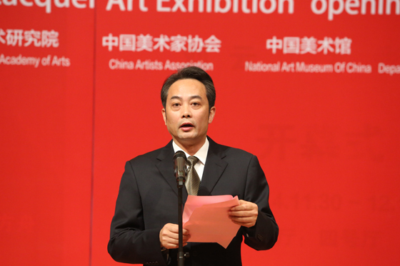 中國美術(shù)館館長吳為山在開幕式致辭時說:“我們的祖先發(fā)現(xiàn)了大漆這種神奇的物質(zhì),并鐘愛漆藝中呈現(xiàn)的溫潤光澤和輕柔手感。通過漆畫、漆器和漆塑的形式表現(xiàn),經(jīng)過堯舜時期的‘觴酌有彩’、漢代的‘錯彩鏤金’,經(jīng)六朝的‘靜穆玄淡’到宋元的‘簡淡清新’,至明后期‘炫技逞巧’,中國漆器發(fā)展到了‘千文萬華紛然不可勝識’的全盛時期。清代工藝流派紛至,更為奇巧。”