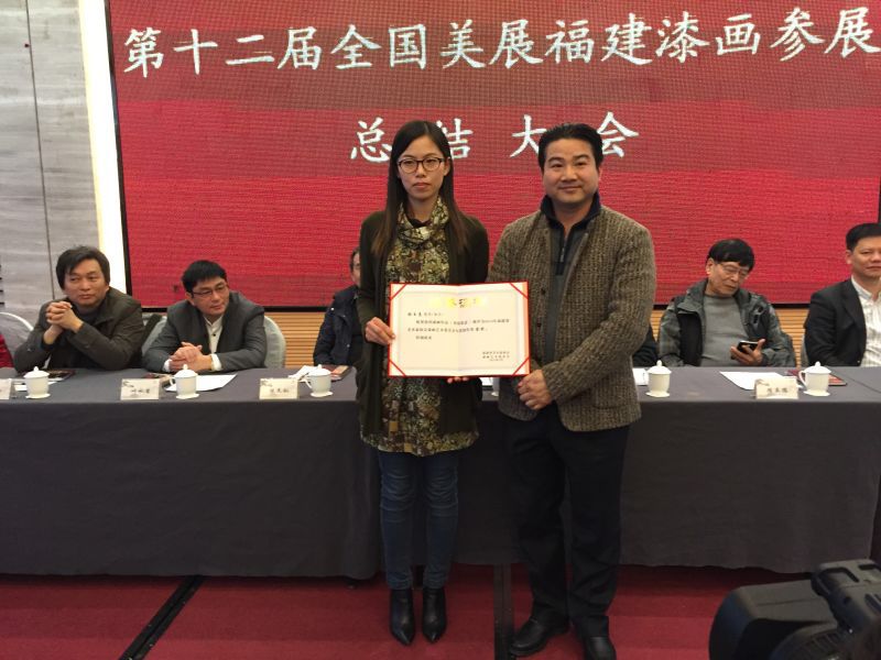 2014年,是福建漆畫迄今為止在全國美展上最為輝煌的一年:全國美展漆畫展區(qū)在全國一千七百多件參評作品中甄選306件參展,其中閩籍作品113件入選,且尚不涵蓋在閩學習創(chuàng)作的15件外省籍作者作品。最終總評中,閩籍漆畫作品包攬金、銀、銅獎以及3個優(yōu)秀獎(本屆全國美展漆畫板塊總共設置了一金一銀一銅7個優(yōu)秀獎),其中,廈門大學美術系碩士生張玉惠作品《織情敘意》榮獲金獎;福州沈克龍作品《花事千年》獲銀獎;廈門大學美術系本科生林智勛、黃建坤合作作品《舊時光》獲銅獎;福建師范大學美術學院本科生陳娜作品《若只如初見》、廈門大學美術系碩士生楊耀斌作品《迷彩青春》、福建師大美術學院教師林宜耕和碩士生李濤合作作品《戲畫人生》獲優(yōu)秀獎,創(chuàng)福建地區(qū)參加全國美展有史以來的最好成績。