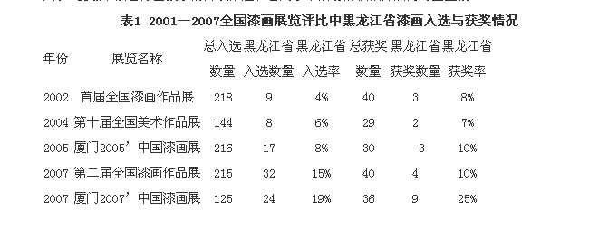21世紀(jì)初,中國(guó)美術(shù)家協(xié)會(huì)漆畫(huà)藝術(shù)委員會(huì)成立大會(huì)在廈門(mén)召開(kāi),國(guó)家級(jí)學(xué)術(shù)機(jī)構(gòu)的設(shè)立為新世紀(jì)初漆畫(huà)的發(fā)展提供了有利條件,各類(lèi)全國(guó)漆畫(huà)展覽評(píng)比接踵而至。黑龍江省漆畫(huà)作品在這些展覽中日漸突出的良好表現(xiàn),標(biāo)志著該省漆畫(huà)步入快速發(fā)展階段?!副?」中含括了2001至2007年黑龍江省漆畫(huà)作品參加各類(lèi)全國(guó)漆畫(huà)展覽評(píng)比情況。資料對(duì)比可見(jiàn),黑龍江省漆畫(huà)作品的入選率和獲獎(jiǎng)率整體呈快速上升趨向。黑龍江省漆畫(huà)從1999年「第九屆全國(guó)美術(shù)作品展」中3幅作品入選,到「廈門(mén)2007’中國(guó)漆畫(huà)展」中入選作品占據(jù)近五分一的份額,間隔還不到十年的時(shí)間。這種成績(jī)的取得主要緣于該省漆畫(huà)教學(xué)的持續(xù)推進(jìn)和省內(nèi)學(xué)術(shù)活動(dòng)的積極開(kāi)展兩方面因素。