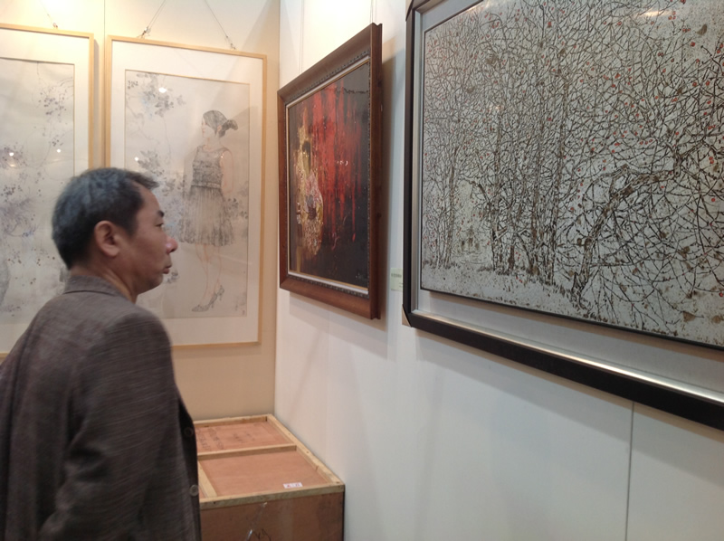 當(dāng)日下午4時(shí)許,在三樓的第四屆中國(guó)畫(huà)節(jié)展廳,一些展區(qū)已經(jīng)開(kāi)始忙著撤展,但是仍有不少收藏家抓住最后的機(jī)會(huì)來(lái)“淘寶”。蘇國(guó)偉、胡本七的漆畫(huà)作品亮相于這次的展會(huì),吸引了眾多的藏家和書(shū)畫(huà)愛(ài)好者。當(dāng)日下午3時(shí)許,在三樓的第四屆中國(guó)畫(huà)節(jié)展廳,一些展區(qū)已經(jīng)開(kāi)始忙著撤展,但是仍有不少收藏家抓住最后的機(jī)會(huì)來(lái)“淘寶”。